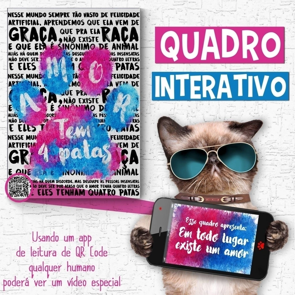 Tendo essa certeza cada vez mais clara pra todos os petlovers, criamos esse quadro, que além de decorar sua parede, é um quadro INTERATIVO! Ao usar qualquer aplicativo de celular capaz de scannear um QR Code você será levado a um vídeo chamado "Em todo lugar existe um amor" uma homenagem a todos os animais que buscam um humano para poder governar!